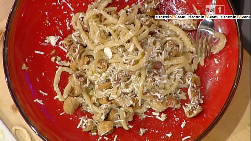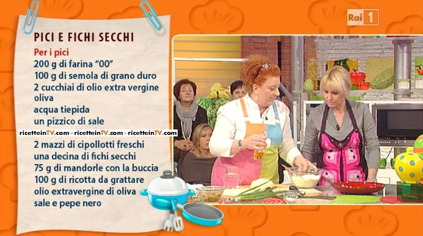 Luisanna mette al lavoro Antonella, deve piciare (Antonella sottolinea come ci sia solo la c e non anche un’altra lettera) ossia preparare i pici, ossia degli spaghetti fatti a mano, quindi deve amalgamare la semola di grano duro, la farina, due cucchiai di olio, acqua tiepida. Ottenuto l’impasto, lo dividiamo in piccole palline, le allunghiamo a grissino, rendendoli fini, e formiamo i pici. Mettiamo i fichi in ammollo per mezz’ora, poi li tagliamo a dadini e li mettiamo in una padella, dove prima abbiamo fatto rosolare i due cipollotti con un goccio di olio. In un’altra padella antiaderente, tostiamo le mandorle con la buccia, poi le tritiamo grossolanamente con la mezzaluna, le uniamo ai fichi. Lessiamo i pici per appena un minuto, li scoliamo e mantechiamo col sugo. Impiattiamo, grattugiamo un po’ di parmigiano e… buon appetito!