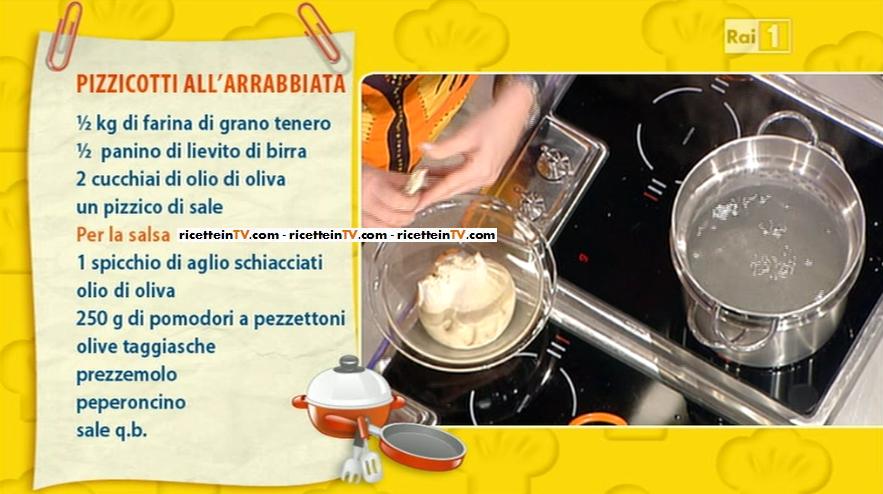 Mettiamo a scaldare l’olio con l’aglio, il peperoncino e le olive taggiasche. Ricaviamo da un panetto di pasta lievitata (500 gr di farina, lievito di birra, olio e acqua) i pizzicotti e li tuffiamo in acqua bollente e salata. Aggiungiamo la polpa di pomodoro all’olio caldo e completiamo con del prezzemolo. Quindi scoliamo i pizzicotti e li condiamo con il sugo all’arrabbiata.