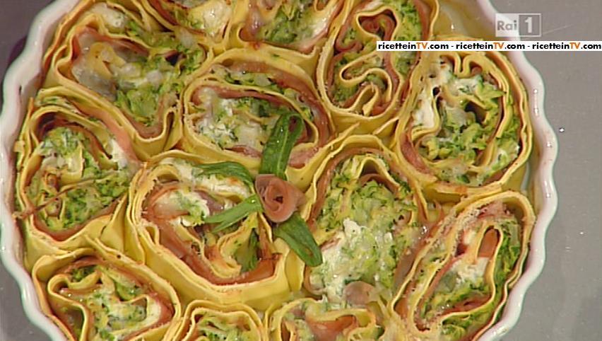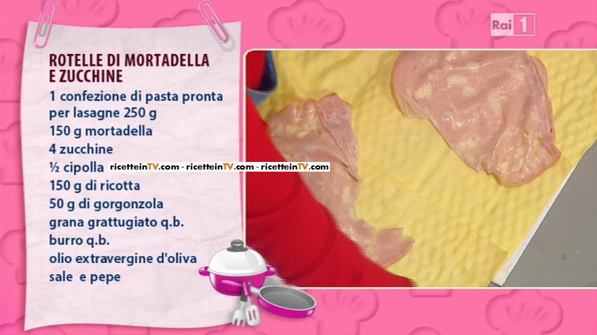 Affettiamo la cipolla e la mettiamo a soffriggere in padella con un filo d’olio. Uniamo le zucchine tagliate alla julienne, saliamo e pepiamo. Completiamo la cottura e lasciamo raffreddare. Sbollentiamo le sfoglie di pasta in acqua salata, per 1 minuto. Le scoliamo, le raffreddiamo in acqua e ghiaccio e le asciughiamo. Disponiamo le sfoglie di pasta in modo da formare un grande rettangolo. Stendiamo sopra le fette di mortadella, le zucchine, il gorgonzola a cubetti, la ricotta a fiocchetti e ancora mortadella. Avvolgiamo la pasta, formando un rotolo. Ricaviamo delle fette alte e le disponiamo in una pirofila imburrata. Mettiamo qualche fiocchetto di burro ed una spolverata di parmigiano grattugiato. Inforniamo a 200° per 10 minuti.