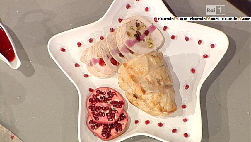Ricaviamo una tasca dalla fesa di tacchino, praticando un’incisione profonda su un lato. Frulliamo parte della fesa ridotta a cubetti con la ricotta, la salsiccia senza budello ed un po’ di panna… Lippi incalza la cuoca: “ce la facciamo in 5 minuti?“, Palma replica stizzita: “visto che ti sei messo il grembiule fai qualcosa, no?!…“. Claudio coglie il rimprovero e sgrana la melagrana, schiacciando i grani, in modo da ricavarne il succo. Tritiamo grossolanamente la frutta secca e la incorporiamo alla farcia, saliamo e pepiamo. Quindi, farciamo la fesa con il composto ottenuto e chiudiamo la tasca con ago e filo. Leghiamo la carne, come fosse un arrosto, la infariniamo, la rosoliamo in padella con un filo d’olio, la trasferiamo in una pirofila con il brodo e la inforniamo per 1 ora a 180°. Una volta cotta, la avvolgiamo in un foglio di carta alluminio e, intanto, prepariamo la salsina, mettendo sul fuoco per 15 minuti il fondo di cottura insieme al succo di melagrana. Completiamo con dei grani di melagrana.
