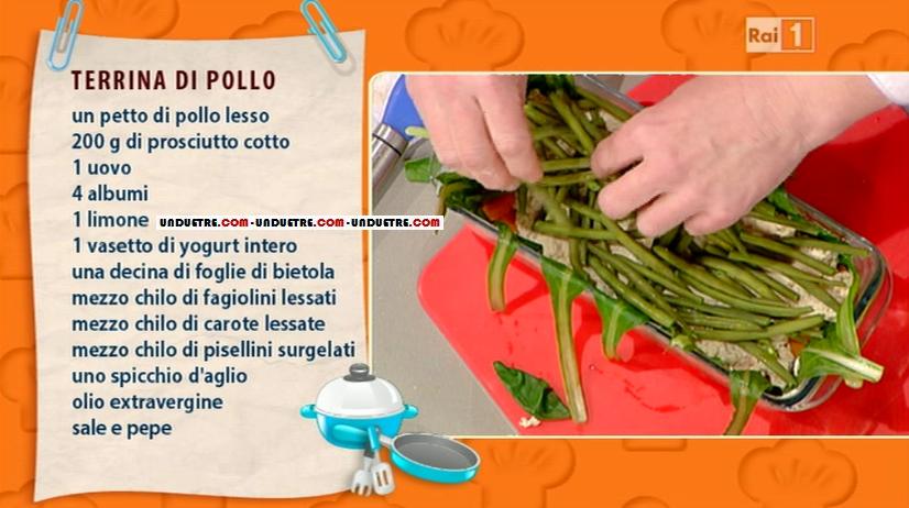 La maestra in cucina della puntata odierna de La prova del cuoco, Luisanna Messeri, ascoltate le lamentele di Antonella, che non ha voluto lavorare, ha preparato la terrina di pollo.