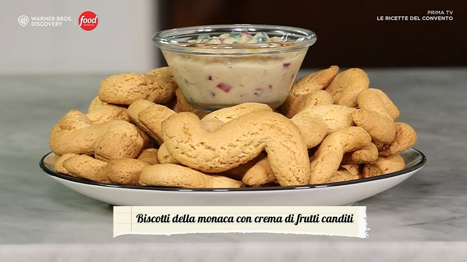 Don Salvatore, cuoco e monaco del monastero  di San Martino delle scale, a Monreale (Sicilia), propone un’altra delle antiche ricette tramandate tra le mura del convento, al centro del programma di Food NetworkLe ricette del convento“, in onda ogni domenica, intorno alle 17:30, sul canale 33 (in streaming su Discoveryplus.it) e dell’omonimo libro che trovate in tutte le librerie. Oggi, in particolare, vediamo come preparare i biscotti della monaca con crema di frutti canditi.