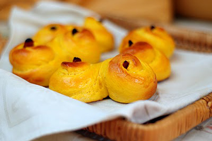 Procediamo: sciogliamo il burro ed uniamo il latte, un pizzico di sale e lo zafferano. Sbricioliamo il lievito, che uniamo al composto insieme alla farina e allo zucchero. Lasciamo lievitare, preoccupandoci di coprire l’impasto. Formiamo dei serpentelli e diamo loro la forma di una ‘S’. Decoriamo con uvette, spennelliamo con l’uovo ed inforniamo a 225° per 10 minuti.