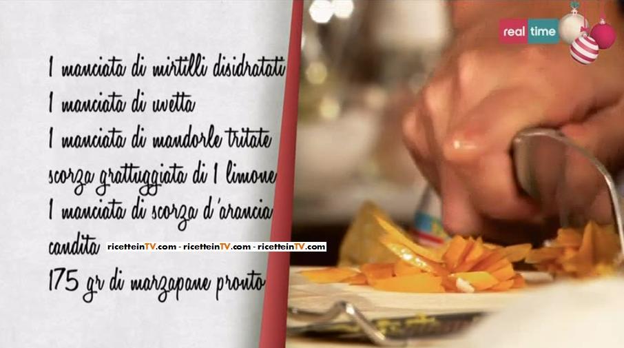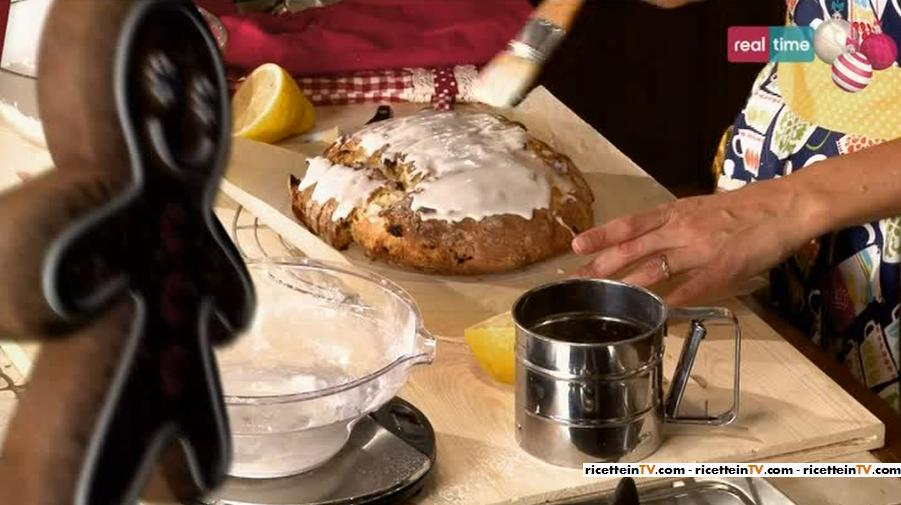 Impastiamo la farina con il latte, nel quale abbiamo sciolto 1 cubetto di lievito di birra, lo zucchero, un pizzico di sale, il burro ammorbidito ed 1 uovo sbattuto. Completiamo con una manciata di mirtilli, una di uvetta, una di mandorle tritate, la scorza grattugiata di un limone ed una manciata di cubetti di scorza d’arancia candita. Lasciamo che l’impasto lieviti per 1 ora. Dopo di che, modelliamo il marzapane, dando la forma di un cilindro. Stendiamo (non troppo) la pasta del pane e mettiamo al centro il marzapane, avvolgendolo con l’impasto. Inforniamo a 190° per 35 minuti. Infine, glassiamo con zucchero al velo (110 gr) e succo di limone (2 cucchiai).