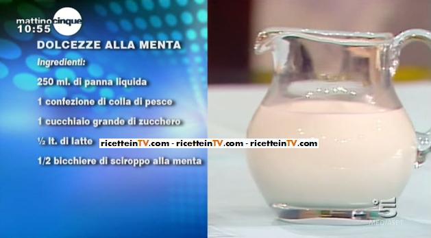 Mettiamo in ammollo, in acqua tiepida, la gelatina di pesce. Intanto, mettiamo a scaldare, in una casseruola sul fuoco, il latte; uniamo la panna, lo zucchero e portiamo ad ebollizione; lasciamo sul fuoco per circa 5 minuti. Quindi, spento il fuoco, aggiungiamo la colla di pesce e giriamo bene, finchè non sarà ben sciolta. Lasciamo raffreddare per circa mezz’ora. Aggiungiamo lo sciroppo alla menta e riempiamo delle ciotoline da macedonia col composto. Riponiamo in frigorifero.