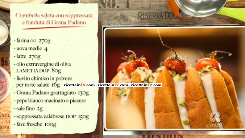 La food blogger Sonia Peronaci, protagonista della rubrica culinaria in onda, dal lunedì al venerdì, alle 10:50, su Rete4, Le ricette di Sonia, utilizzando alcune delle eccellenze nostrane, ha preparato un piatto che celebra la ricca cucina regionale dello stivale, la ciambella salata con soppressata fave e fonduta di Grana. Di seguito ingredienti e procedimento.