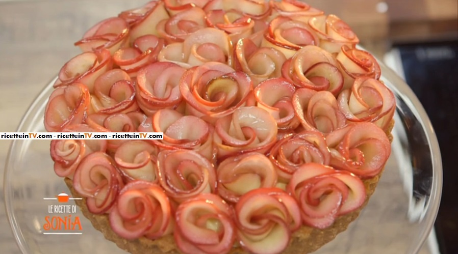 Lava le mele, elimina il torsolo centrale e tagliale a metà, poi a fettine dello spessore di 1 mm con una mandolina. Puoi compiere questa operazione aiutandoti con un levatorsolo. Immergi le fettine di mela in uno sciroppo di acqua, zucchero e succo di limone e lasciale cuocere per circa 5 minuti in modo che si ammorbidiscano ma senza rompersi. Puoi aromatizzare ulteriormente l’acqua dello sciroppo con il tuo liquore preferito. Una volta cotte, mettile a scolare su una gratella. Con le fette di mela, forma tante roselline di dimensioni diverse che posizionerai sulla superfice della crostata. Termina la crostata con della gelatina spray.