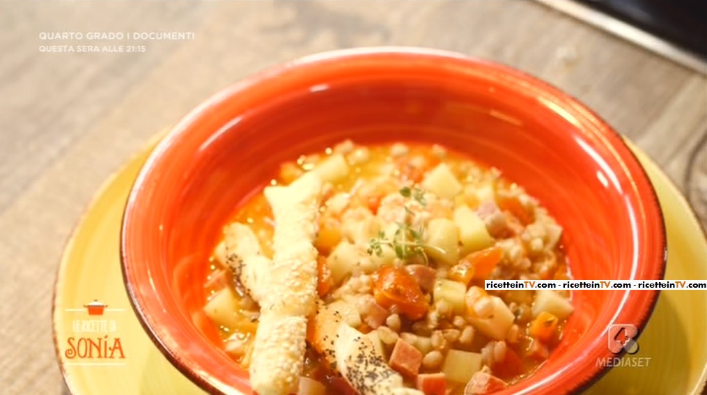 - farro perlato decorticato 200 gr, prosciutto crudo di Norcia 100 gr in una fetta unica, rosmarino 1 rametto, salvia 2 foglie, timo 3 rametti, maggiorana 3 rametti, aglio 1 spicchio, peperoncino rosso piccante 1, cipolla dorata 100 gr, carota 200 gr, sedano 100 gr, pomodorini 200 gr, patate 350 gr, brodo vegetale 1,5 l, olio extravergine d’oliva 30 gr, sale q.b., pepe nero macinato q.b.