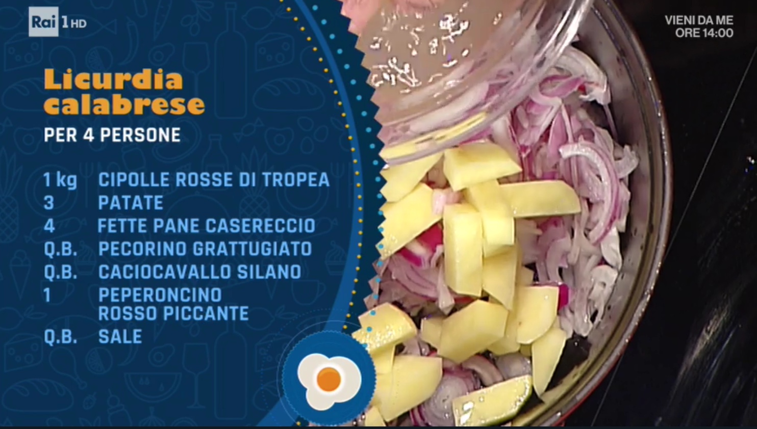 licurdia calabreseDopo aver disquisito lungamente sulle qualità e le proprietà del pomodoro insieme a nutrizionista ed agronomo, Elisa raggiunge Luca Pappagallo insieme a Caterina Balivo, in studio per promuovere il suo Vieni da me, al debutto dopo il Tg. Con Luca prepariamo una zuppa calabrese, la licurdia calabrese.