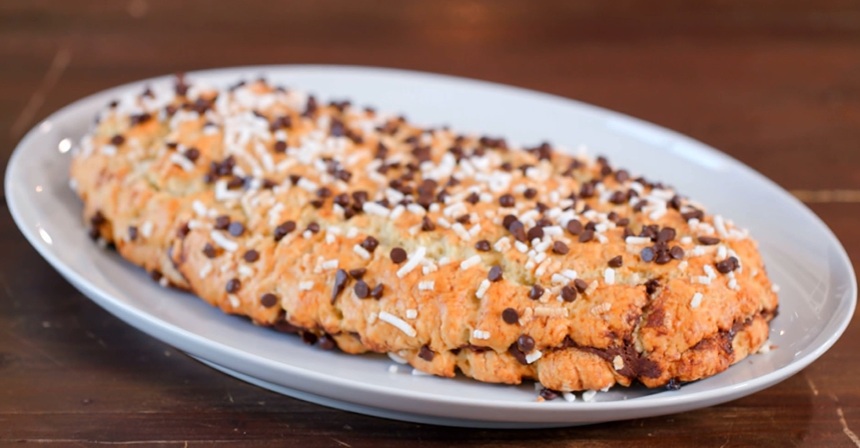 Sigilliamo bene i bordi, spennelliamo la superficie con il latte e le uova sbattuti insieme, infine, cospargiamo con la granella di zucchero e le gocce di cioccolato. Inforniamo in forno preriscaldato a 190° per circa 40 minuti o fino a doratura.