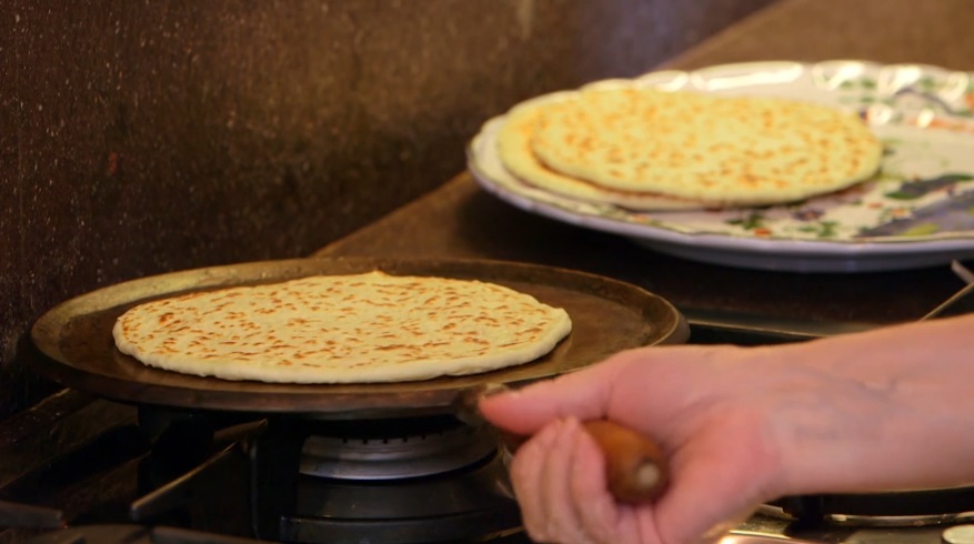 Ottenuto un composto liscio ed omogeneo, formiamo dei panetti da 100 g l’uno. Scaldiamo bene sul fuoco una padella antiaderente. Nel frattempo stendiamo con il mattarello i panetti di pasta, all’altezza di mezzo centimetro circa.