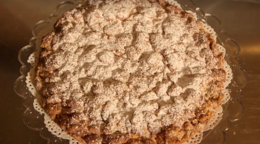 Sbricioliamo metà dell’impasto in una tortiera imburrata, distribuiamo sopra metà delle mandorle tritate e l’impasto rimasto e sbriciolato con le mani. Distribuiamo sopra le mandorle rimaste. A parte, montiamo leggermente l’albume con un goccio di Recioto. Spennelliamo la torta con l’albume montato e distribuiamo sopra le mandorle intere. Cuociamo in forno preriscaldato a 180° per 40 minuti.