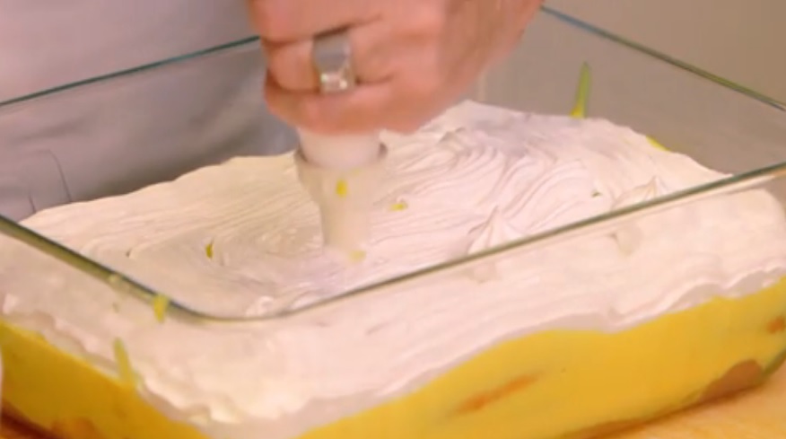 Prepariamo la meringa. Montiamo con le fruste elettriche gli albumi, aggiungendo pian piano lo zucchero. Montiamo fino ad ottenere un composto fermo e lucido. Copriamo l’ultimo strato di crema con la meringa ottenuta. Cuociamo nel forno socchiuso a 90° per circa due ore.