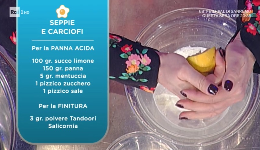 • Panna acida: 100 g succo limone, 150 g panna, 5 g mentuccia, 1 pizzico di zucchero, 1 pizzico di sale