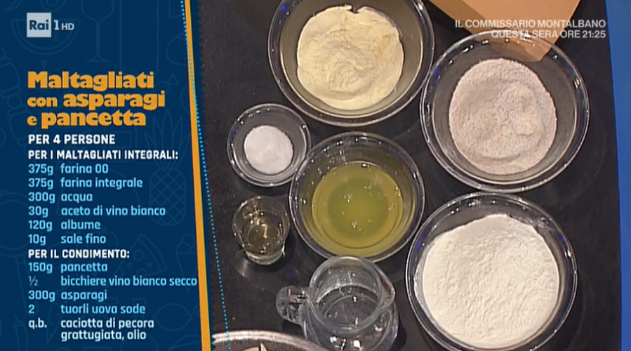 - Maltagliati: 375 g farina 00, 375 g farina integrale, 300 g acqua, 30 g aceto di vino bianco, 120 g albume, 10 g sale fino