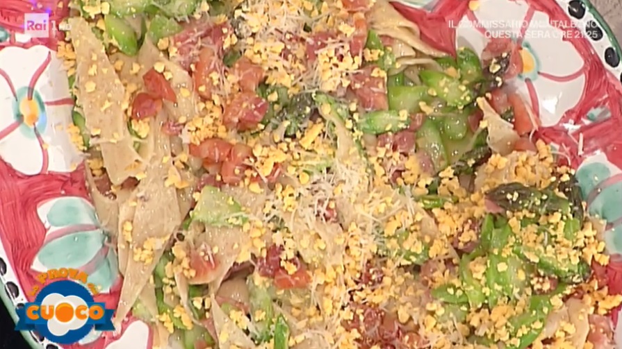 - Condimento: 150 g pancetta, mezzo bicchiere di vino bianco, 300 g asparagi, 2 tuorli d’uovo sodi, caciotta di pecora grattugiata, olio