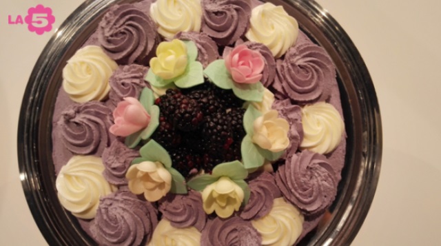 Farcitura e decorazione: preparare la crema al formaggio sbattendo con una frusta elettrica 500 g di formaggio fresco spalmabile con 250 g di zucchero al velo. Montare la panna versando 5 buste di pannafix in 1 l di panna con 100 g di zucchero al velo e qualche goccia di colore blu e rosso (fino ad ottenere un composto della tonalità di colore desiderato). Tagliare la torta raffreddata in 2 dischi e bagnarli con il succo di frutti rossi. Con l’aiuto di una tasca da pasticcere farcire il perimetro della torta con la panna colorata lasciandone da parte a sufficienza per rivestirla e per la decorazione finale. Riempire il centro con una parte la crema al formaggio lasciandone da parte a sufficienza per la decorazione finale. Aggiungere una parte delle more e ricomporre la torta. Rivestire la torta con la panna colorata. Con l’aiuto di una tasca da pasticcere decorare la sommità della torta con ciuffi di panna colorata e crema al formaggio facendo attenzione a lasciare uno spazio libero al centro. Disporre le more rimanenti al centro e aggiungere le decorazioni in ostia.