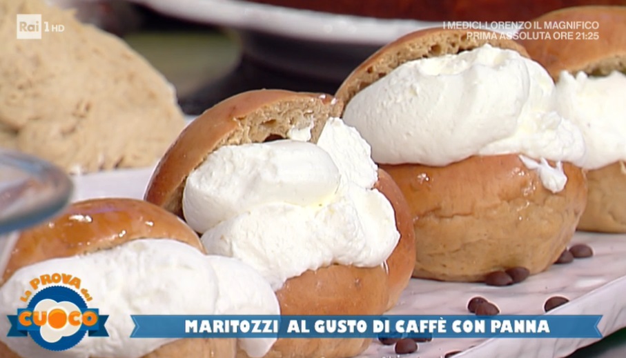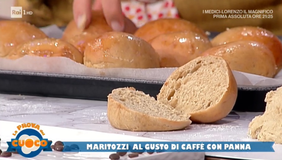 Preleviamo dei panetti (di 50-60 g) dall’impasto lievitato, formiamo delle palle lisce, quindi le allunghiamo leggermente, in modo da ottenere la forma classica del maritozzo. Copriamo e lasciamo lievitare ancora fino al raddoppio. Inforniamo a 190° per 6-10 minuti circa. Lasciamo raffreddare, quindi tagliamo a metà, lasciando unite le due metà su un lato. Farciamo con la panna montata. Finiamo con zucchero a velo e polvere di caffè.
