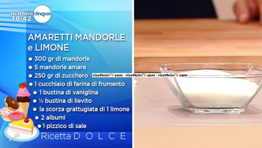 - 300 g mandorle, 5 mandorle amare, 250 g zucchero, 1 cucchiaio di farina di frumento, 1 bustina di vaniglia, 1/2 bustina di lievito per dolci, scorza grattugiata di 1 limone, 2 albumi, 1 pizzico di sale