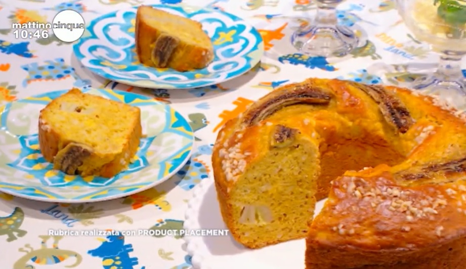 - 400 g banane, 250 g farina manitoba, 4 uova, spremuta di 1 arancia, 50 g granella di mandorle, vaniglia, 1 cucchiaio di miele, 1 bustina di lievito per dolci, mezzo cucchiaino di cannella