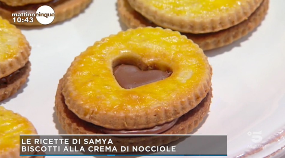 Stendiamo la frolla con il mattarello all’altezza di 3-4 mm. Ricaviamo dei dischetti. Su una metà dei dischi ottenuti pratichiamo un foro con un coppapasta piccolo. Spennelliamo i dischi forati con il tuorlo sbattuto (possiamo evitarlo). Cuociamo i biscotti in forno caldo e statico a 160° per 20 minuti. Lasciamo raffreddare i biscotti, quindi spalmiamo sui dischi interi della crema di nocciole; infine sovrapponiamo un biscotto forato.