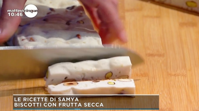 A questo punto, uniamo la frutta secca, pistacchi, nocciole e mandorle, sgusciata ma intera. Mescoliamo con una spatola.