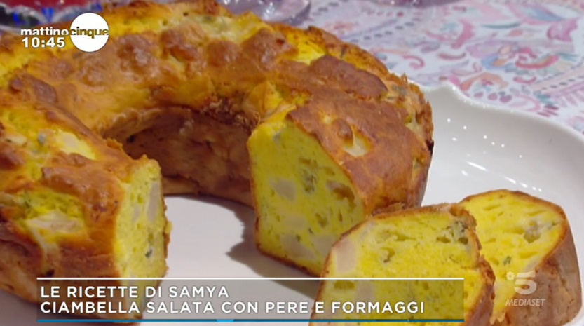 - 3 pere williams, 100 g formaggio roquefort dolce, 100 g formaggio gruviera grattugiato, 350 g farina 00, 6 uova, 100 ml panna fresca, 80 g burro fuso, 2 foglie di salvia, 1 bustina di lievito per dolci, sale, pepe