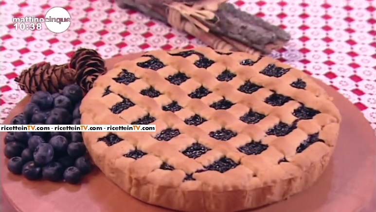 All’interno del guscio di frolla bucherellato mettiamo la confettura di mirtilli. Copriamo con le strisce, che disponiamo in modo da formare una griglia. Inforniamo a 180° per circa 1 ora.