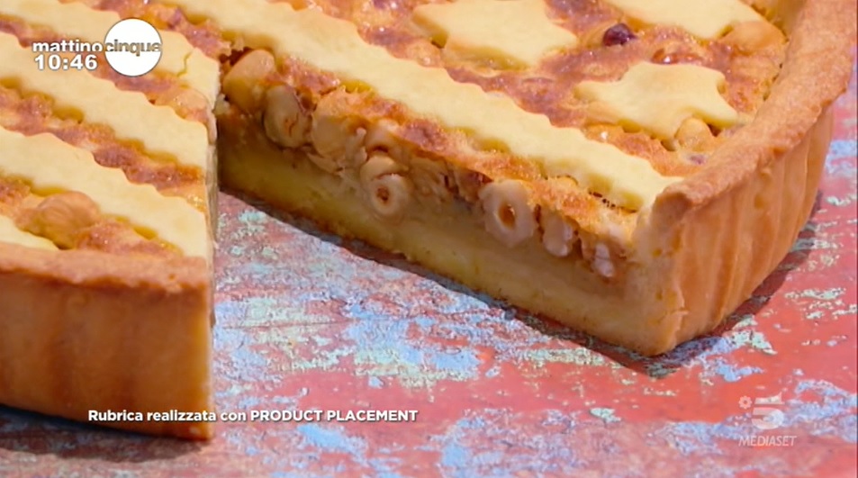 - 800 g pasta frolla, 250 g nocciole, 80 g zucchero di canna, 80 ml sciroppo di mais, 50 g burro fuso, 3 uova, vaniglia, sale
