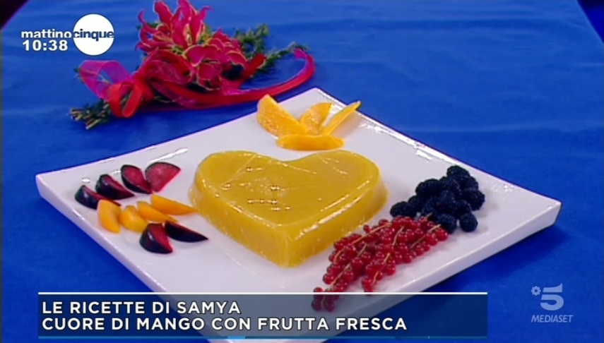 Tagliamo la frutta che ci servirà per decorare a spicchi (Samya usa le susine, il mango, le more ed il ribes). La disponiamo accanto o sopra al cuore di mango.