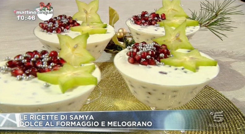 La ricetta del dolce al formaggio e melograno, proposta da Samya a Mattino Cinque il 12 dicembre 2014.