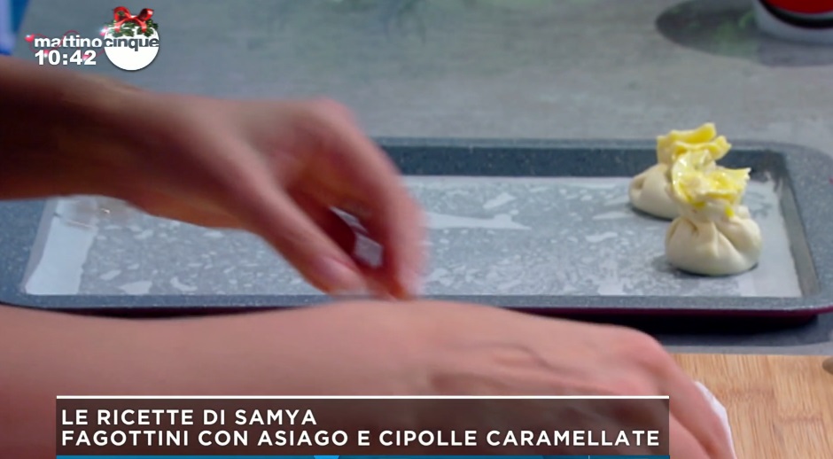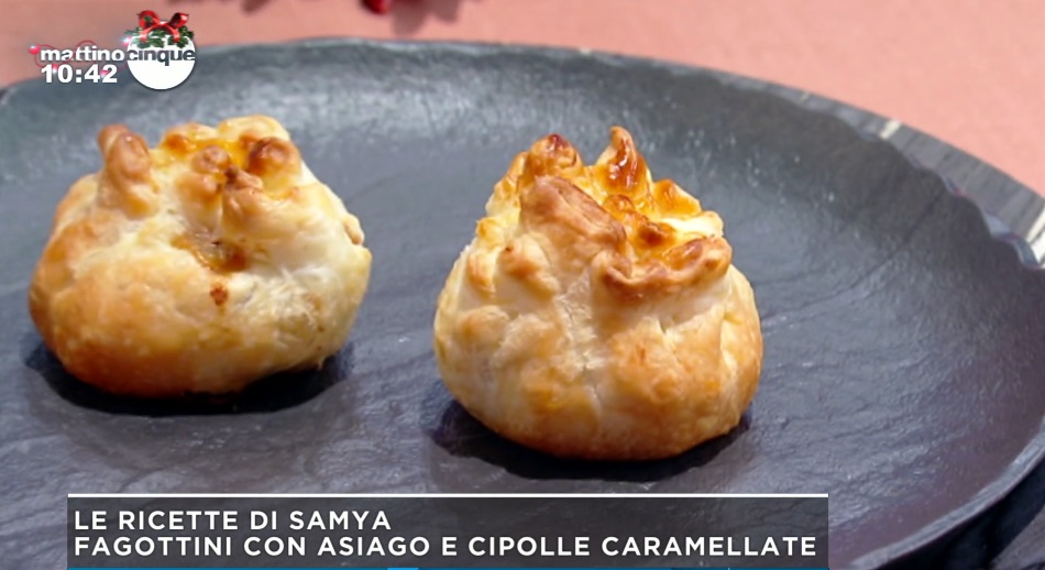 Ricaviamo dei quadrati di 7-8 cm per lato dal rotolo di pasta sfoglia rettangolare. Al centro di ogni quadrato mettiamo un cucchiaio circa di cipolla caramellata ormai fredda, qualche cubetto di formaggio Asiago e spennelliamo i bordi con un tuorlo d’uovo. Richiudiamo la sfoglia sul ripieno, arricciandola alla sommità. Cuociamo in forno caldo e statico a 180° per 20 minuti.
