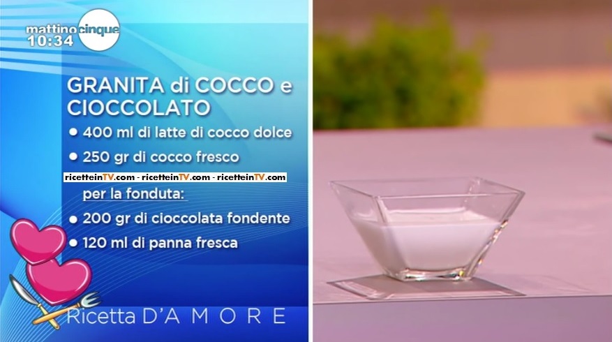 Mettiamo il latte di cocco dolce nelle vaschette da ghiaccio e mettiamo a congelare per un paio d’ore in freezer, in modo da ottenere tanti cubetti. Intanto, sciogliamo a bagnomaria il cioccolato con la panna fresca. Affettiamo il cocco fresco con il pelapatate. Quando il latte di cocco è ben congelato, trasferiamo i cubetti in un frullatore e tritiamo, fino ad ottenere la consistenza di una granita. Alla base delle coppe, mettiamo la fonduta di cioccolato, quindi sovrapponiamo il cocco a fettine sottili e completiamo con la granita.