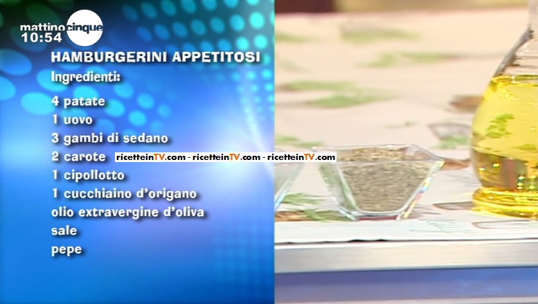 Peliamo le patate e le lessiamo in acqua bollente. Tagliamo il sedano a tocchetti; riduciamo il cipollotti in pezzi grossi e facciamo lo stesso con le carote. Tritiamo grossolanamente sedano, carote e cipolla con il mixer. Schiacciamo le patate lesse e le condiamo con origano, sale e pepe; uniamo il trito di verdure, l’uovo ed un goccio d’olio; mescoliamo. Formiamo gli hamburgherini e li cuociamo in padella, con un filo d’olio. Li asciughiamo leggermente con carta assorbente e serviamo.