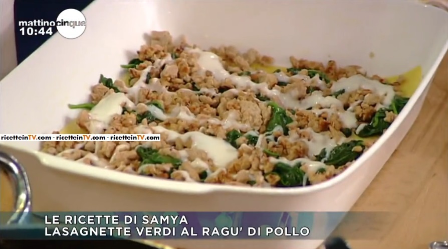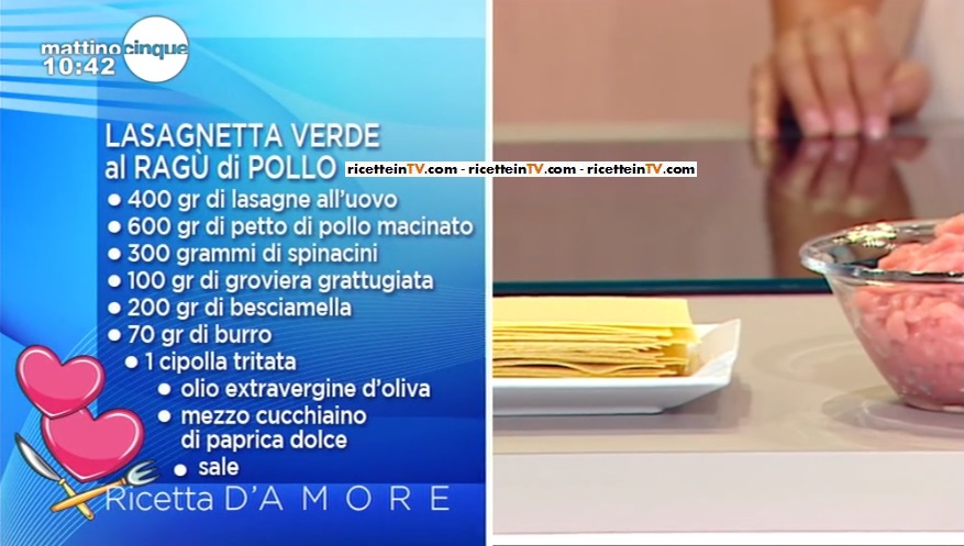 - 400 g lasagne all’uovo, 600 g petto di pollo macinato, 300 g spinacini, 100 g groviera grattugiata, 200 g besciamella, 70 g burro, 1 cipolla tritata, olio extravergine di oliva, mezzo cucchiaino di paprica dolce, sale