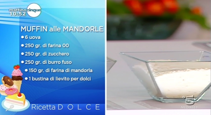La ricetta dei muffin alle mandorle, proposta da Samya a Mattino Cinque il 28 novembre 2014.