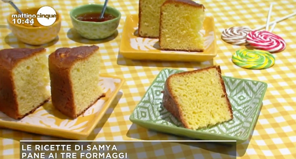 pane ai tre formaggiSamya Abbary, l’attrice marocchina che propone, all’interno di MattinoCinque, le sue ricette, quest’oggi ha proposto un lievitato ricco di gusto e perfetto per l’aperitivo, il buffet o una merenda nutriente. Ecco del pane ai tre formaggi. Ingredienti e procedimento.
