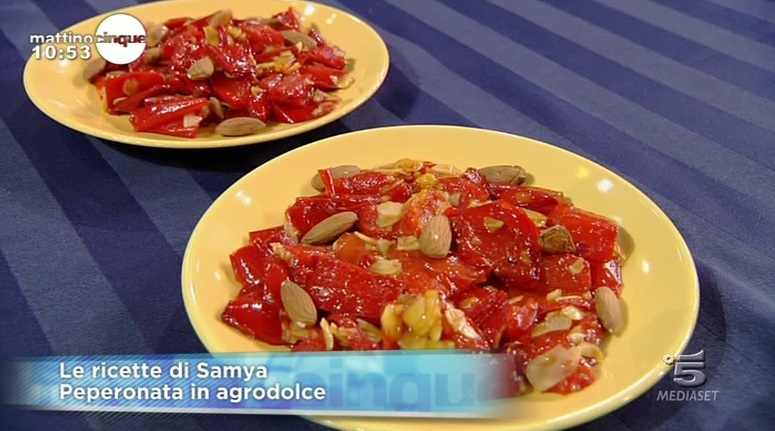 Samya Abbary, l’attrice marocchina che propone, all’interno di MattinoCinque, le sue ricette, quest’oggi ha preparato la peperonata in agrodolce.