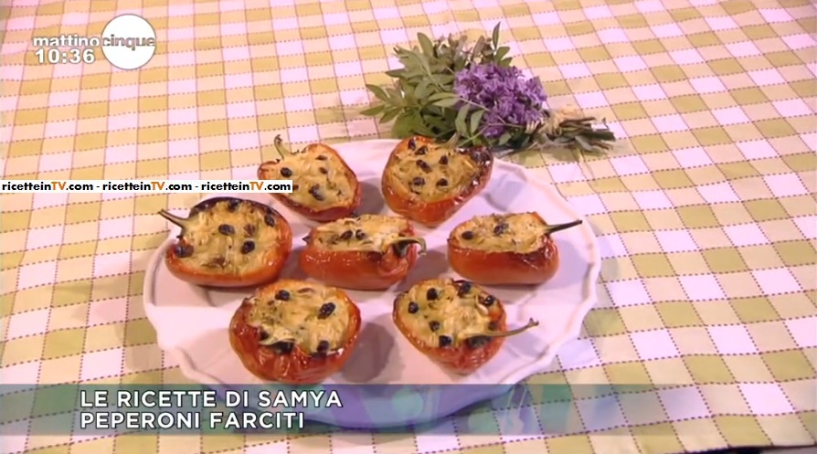Mettiamo in ammollo, in acqua tiepida, l’uvetta. Riempiamo d’acqua una pentola; la saliamo e facciamo cuocere il riso; scolandolo al dente. Tagliamo i peperoni a metà, per il lungo e li priviamo dei semi. Scaldiamo un filo d’olio in padella e rosoliamo la cipolla tritata; intanto, tostiamo i pinoli in una padellina; quando la cipolla è dorata, spegniamo. In una ciotola, mescoliamo il riso scolato e passato sotto l’acqua corrente con i pinoli tostati, la cipolla rosolata, l’uvetta scolata e le uova; farciamo i peperoni con il composto ottenuto. Disponiamo sulla teglia e copriamo i gambi con dei pezzetti di carta alluminio. Mettiamo un dito di acqua sul fondo della teglia e inforniamo a 180° per 35 minuti circa.