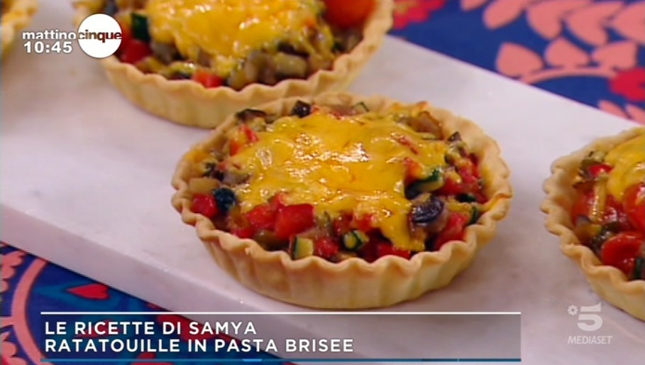 ratatouille in pasta briseeSamya Abbary, l’attrice marocchina che propone, all’interno di MattinoCinque, le sue ricette, quest’oggi ha preparato un piatto sfizioso a base di verdure, ottimo per un buffet o un ricco antipasto. Ecco la ricetta della ratatouille in pasta brisee.