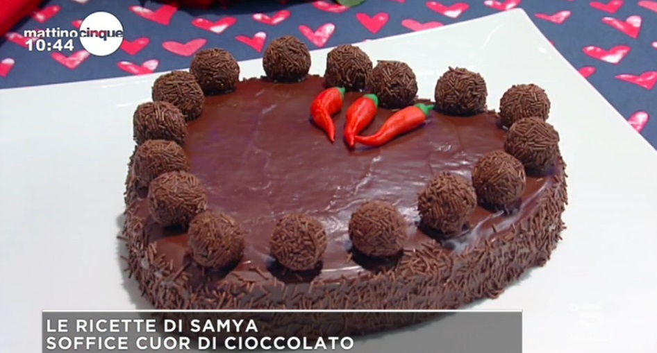soffice cuor di cioccolatoSamya Abbary, l’attrice marocchina che propone, all’interno di MattinoCinque, le sue ricette, quest’oggi ha proposto una torta perfetta per festeggiare San Valentino insieme alla propria metà, ricca di cioccolato e gradevole alla vista. Ecco della torta soffice cuor di cioccolato. Ingredienti e procedimento.