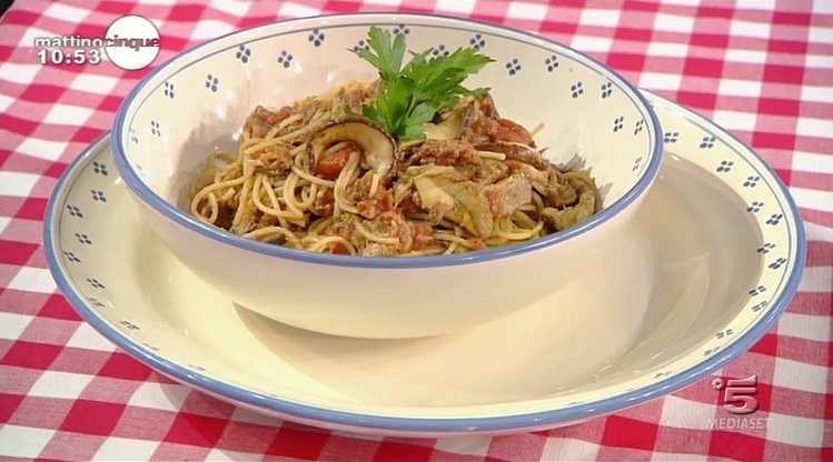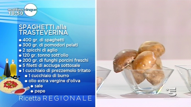 La ricetta degli spaghetti alla trasteverina, proposta da Samya a Mattino Cinque il 20 ottobre 2014.