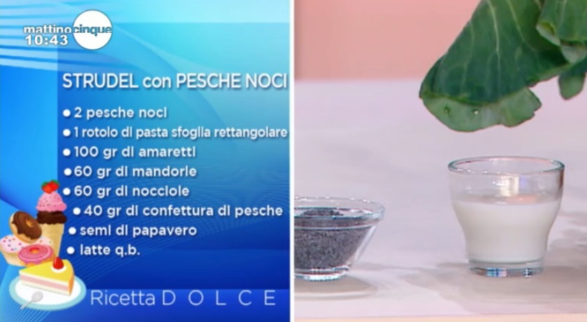 - 2 pesche noci, 1 rotolo di pasta sfoglia rettangolare, 100 g amaretti, 60 g mandorle, 60 g nocciole, 40 g confettura di pesche, semi di papavero, latte