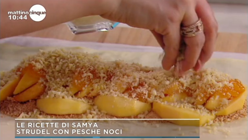Stendiamo il rotolo di pasta sfoglia, quindi disponiamo al centro gli amaretti in polvere. Adagiamo sopra le pesche noci a fettine e copriamo con la confettura di pesche, le mandorle e le nocciole in polvere.