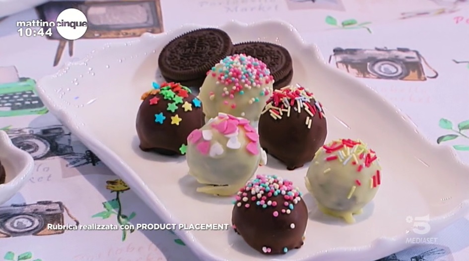 - 300 g biscotti Oreo, 150 g formaggio spalmabile, 100 g cioccolato fondente, 100 g cioccolato bianco, zuccherini