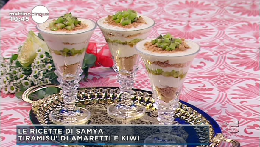 - 100 g amaretti, 5 kiwi, 400 g ricotta di pecora, 2 albumi, 80 g zucchero, 120 ml sciroppo di frutta