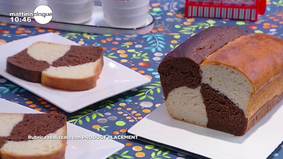 Formiamo dei salsicciotti con le 4 palline lievitate, della lunghezza di uno stampo da plumcake. Imburriamo ed infariniamo lo stampo, quindi adagiamo alla base un salsicciotto bianco ed uno scuro. Sopra, adagiamo gli altri due salsicciotti, invertendo i colori. Copriamo e lasciamo lievitare ancora 30 minuti al caldo. Cuociamo in forno caldo e statico a 180° per 40 minuti.