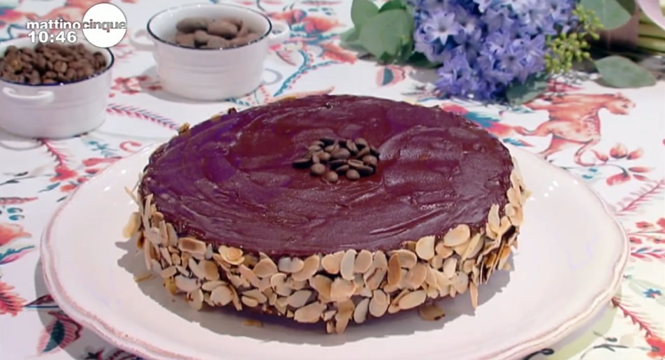 Torta: sciogliamo il cioccolato fondente a bagnomaria ed uniamo una tazzina di caffè espresso. Trasferiamo la miscela ottenuta in una ciotola, in modo da farla intiepidire. In una ciotola montiamo gli albumi a neve con un pizzico di sale. A parte, lavoriamo con le fruste i tuorli con lo zucchero fino ad ottenre un composto chiaro. Uniamo, quindi, il burro morbido a pezzetti e lavoriamo. A questo punto, incorporiamo la farina manitoba e mescoliamo con una spatola, aggiungendo anche la miscela di cioccolato e caffè e gli albumi montati a neve (mescolate delicatamente in questa fase). Per ultimo, incorporiamo la farina di mandorle. Ottenuto un composto omogeneo, lo versiamo all’interno di una tortiera imburrata e foderata con carta forno. Cuociamo in forno già caldo e statico a 180° per 45 minuti. Sforniamo e lasciamo raffreddare.