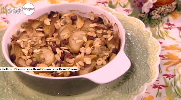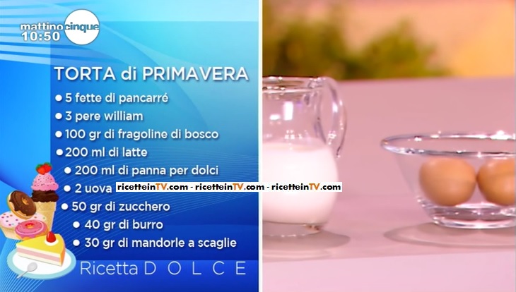 - 5 fette di pancarrè, 3 pere william, 100 g fragoline di bosco, 200 ml latte, 200 ml panna per dolci, 2 uova, 50 g zucchero, 40 g burro, 30 g mandorle a scaglie