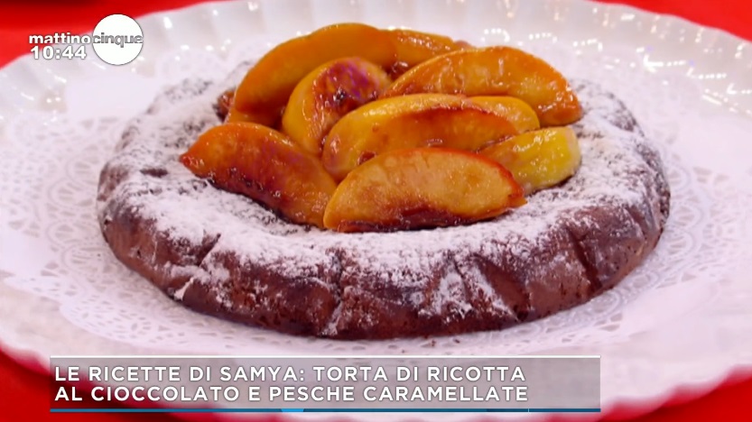 - 250 g cioccolato fondente, 100 g ricotta, 3 pesche noci, 4 uova, 30 g burro, 30 g zucchero di canna, 15 g amido di mais, 40 g zucchero, succo di mezzo limone, un pizzico di sale